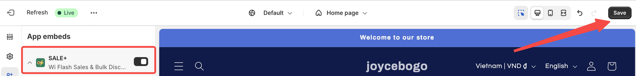 Answer: If you've installed SALE+ and choose to enable the countdown timer but cannot see it, please check if you've activated the SALE+ app embed on your store theme.