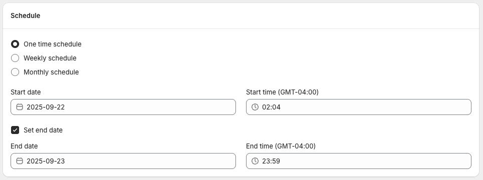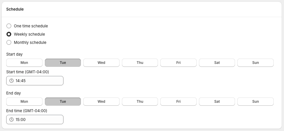 Weekly schedule: Instead of setting up a one-time schedule each week, this feature will automatically activate and end Price Edit tasks based on the time you've set for any day of the week.