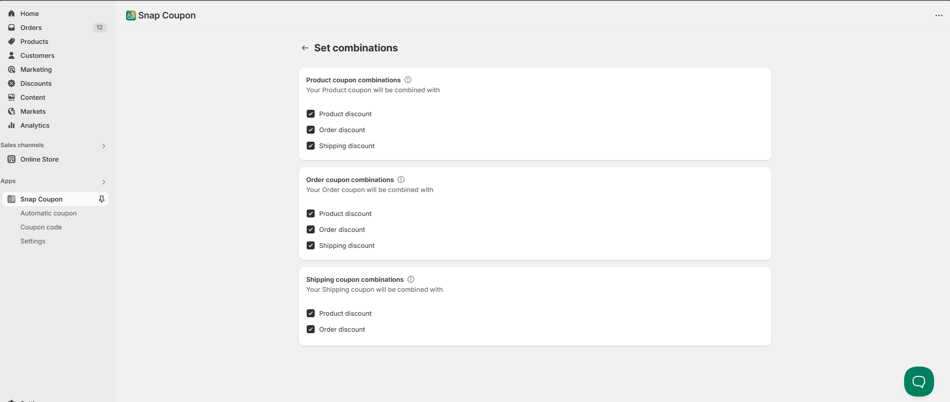 - For example, if you want your coupon to combine with a shipping discount, you must enable the combination in both the coupon and the shipping discount settings. If you only set it from one side, the combination will not work, and your customers will only be able to use the discount with the largest value as per Shopify's default rules.