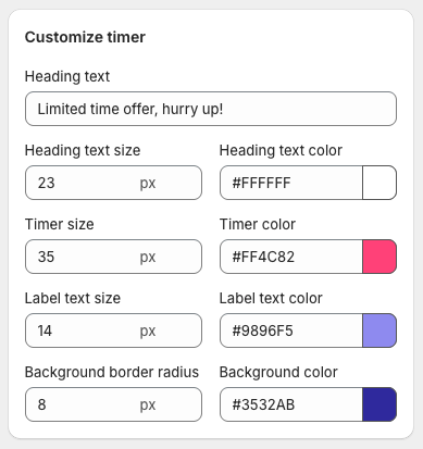 - Adjust size: Modify the size of the heading text, timer, timer label, and the border radius of the countdown timer box.