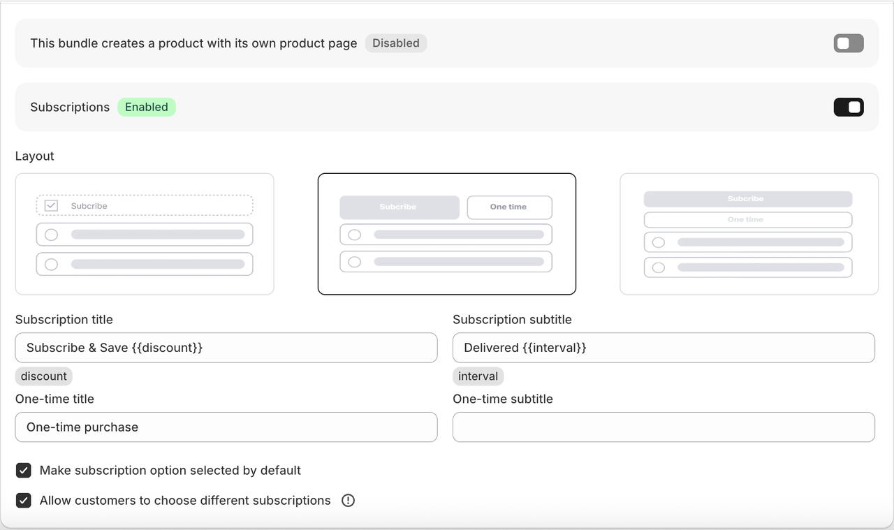 - Allow multiple subscriptions: If enabled, all available subscription types (selling plans) will be shown on the storefront.