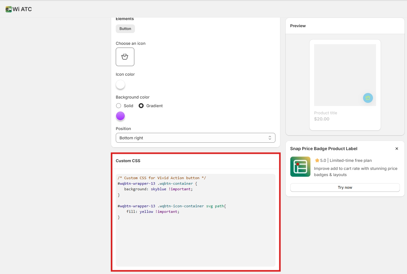 - When you save the button with Custom CSS, the storefront will apply the CSS you entered.