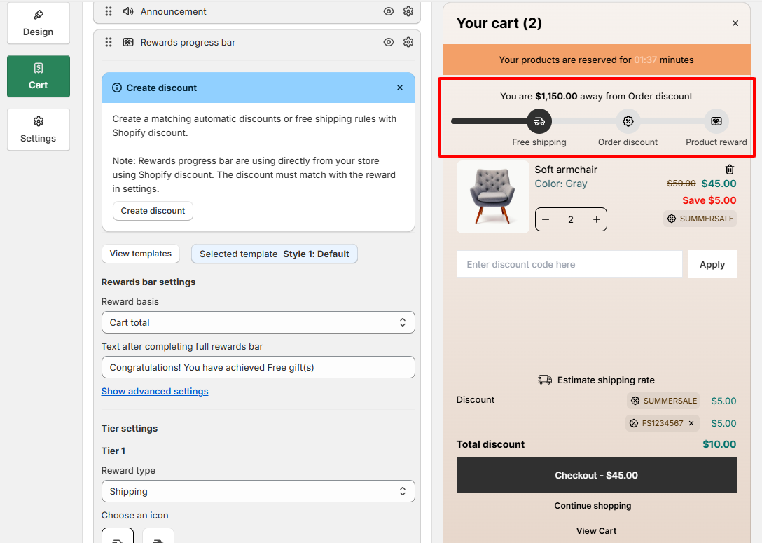 Add product recommendations and a rewards progress bar to your cart drawer.