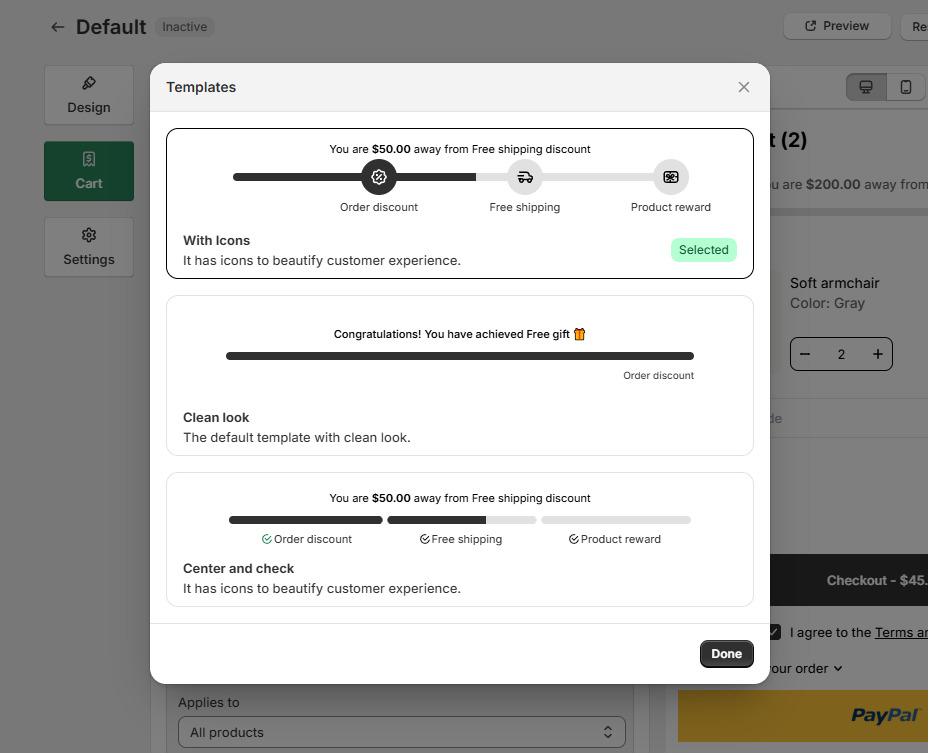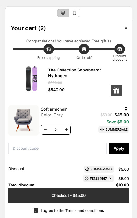 The Rewards Progress Bar is a dynamic progress bar in the Snap Cart Drawer app that shows customers how much more they need to spend to unlock a reward (e.g. a order discount, free shipping, or a free gift). This feature helps increase your average order value by motivating customers to add more items to their cart.