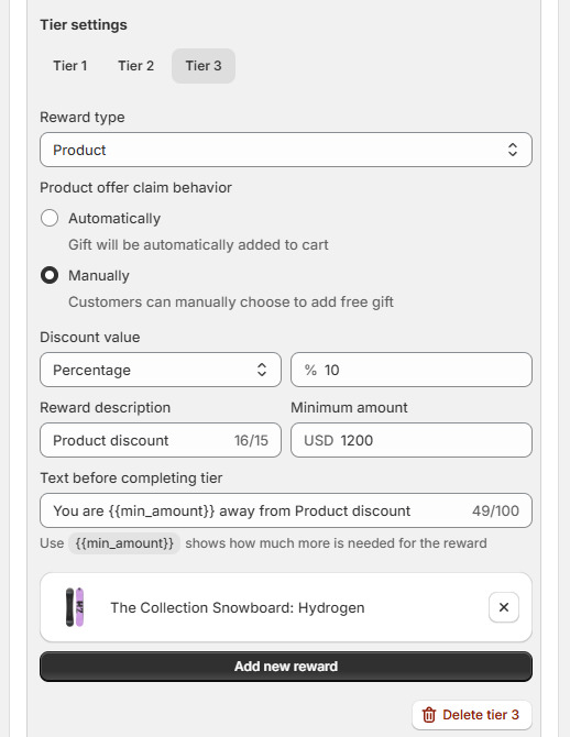 - Reward description: The name of the applied discount will be displayed at the storefront