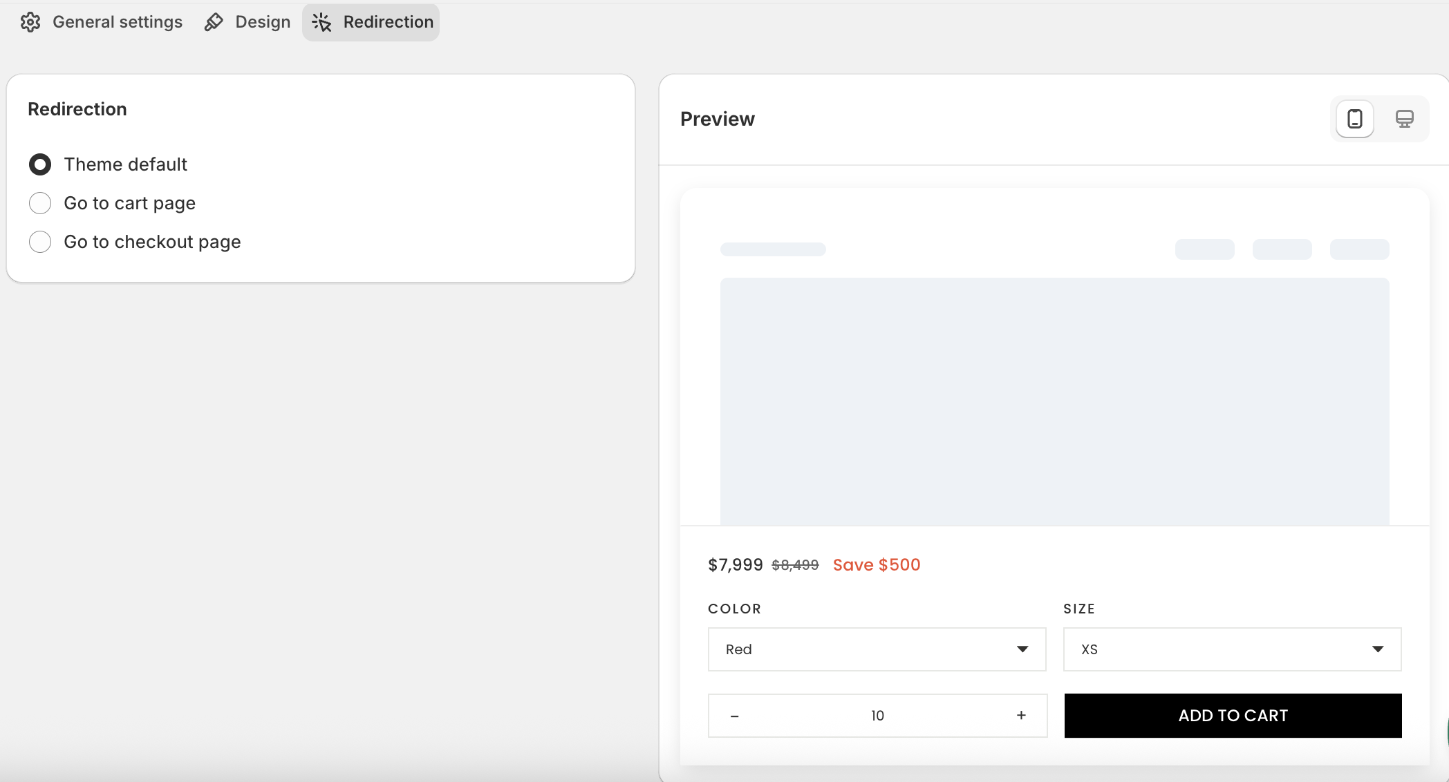 - Theme Default: Follow the default button action set in your Shopify theme.