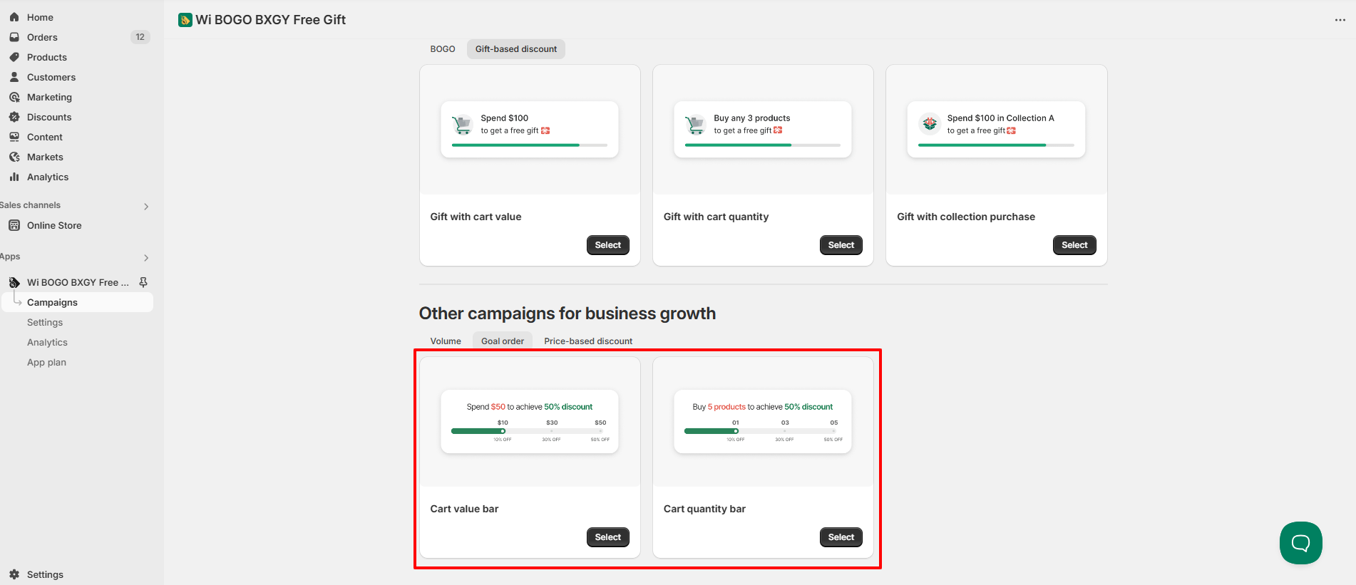 - Goal Order Discount: Unlock discounts when cart reaches a set value