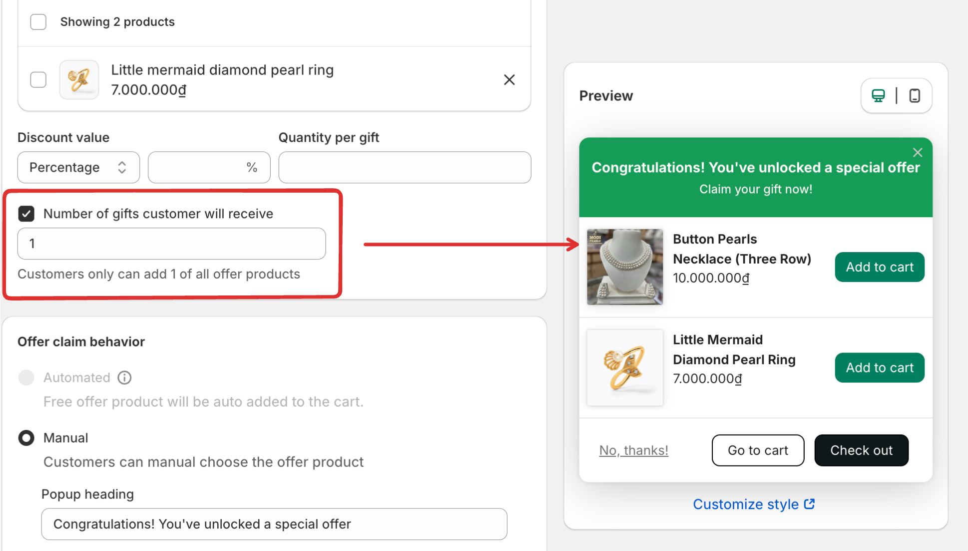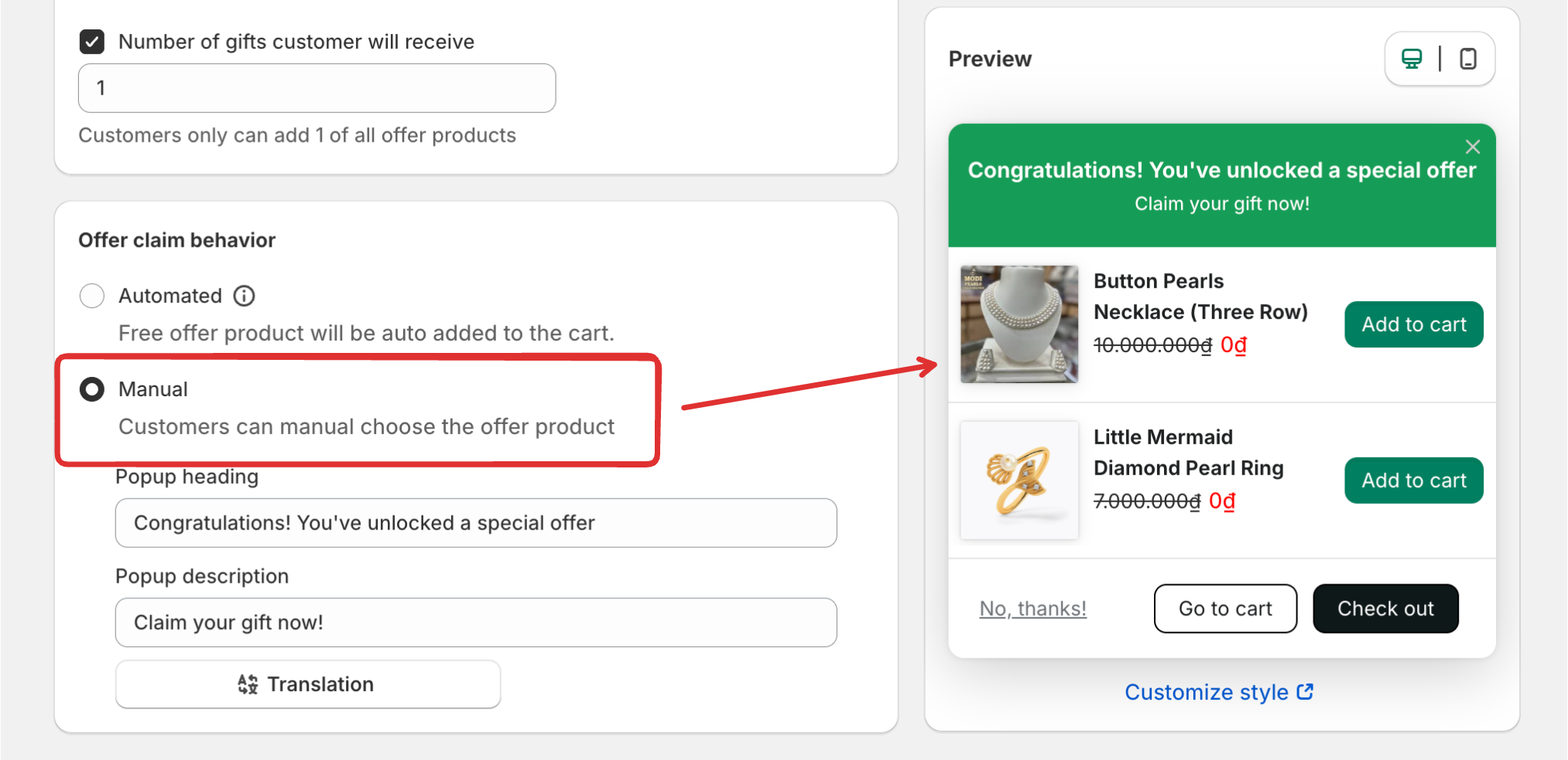 - Manual: Customers will get the offer product manually from the popup display on the storefront.