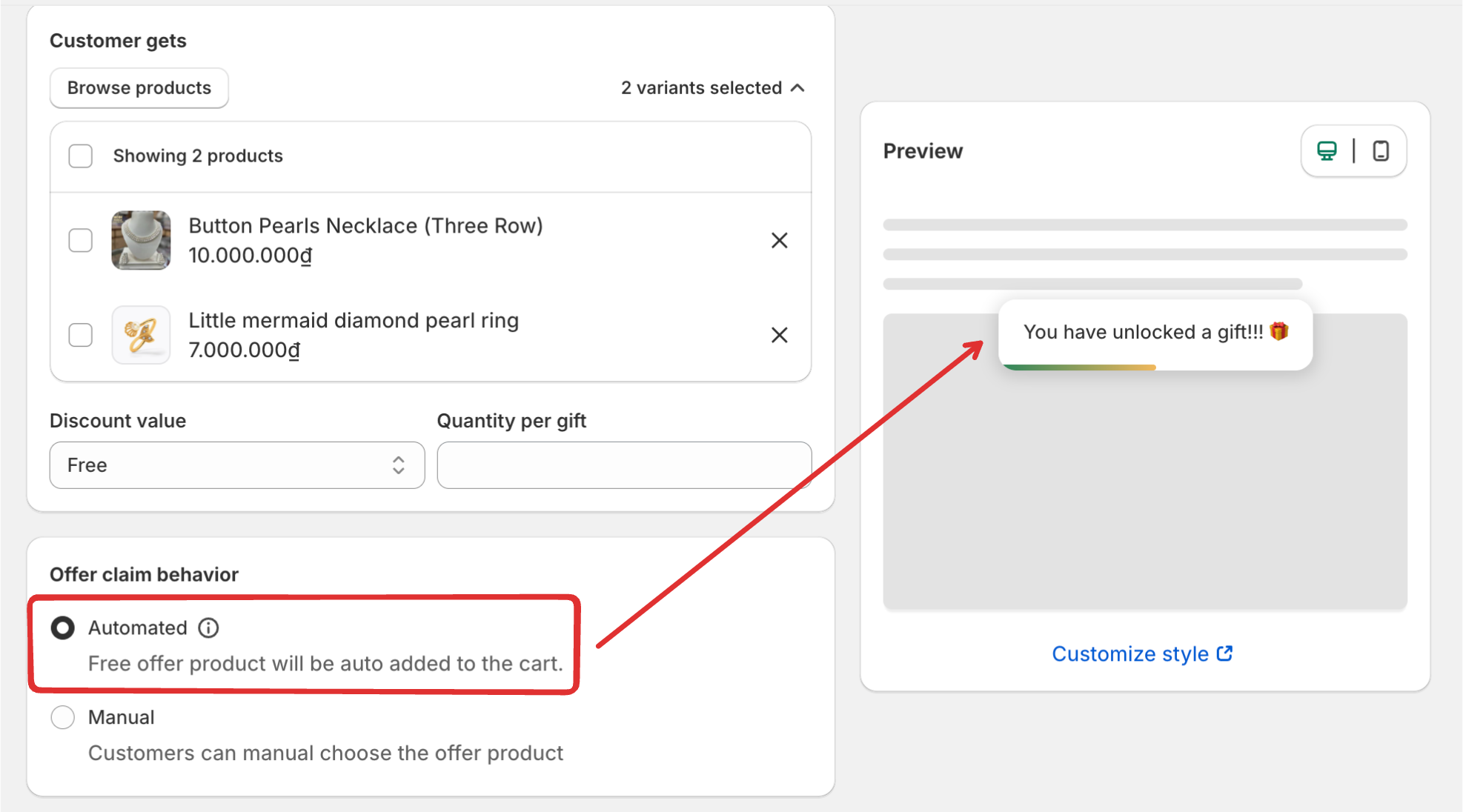 - Automated: The offer product will be auto-added to the customer's cart.