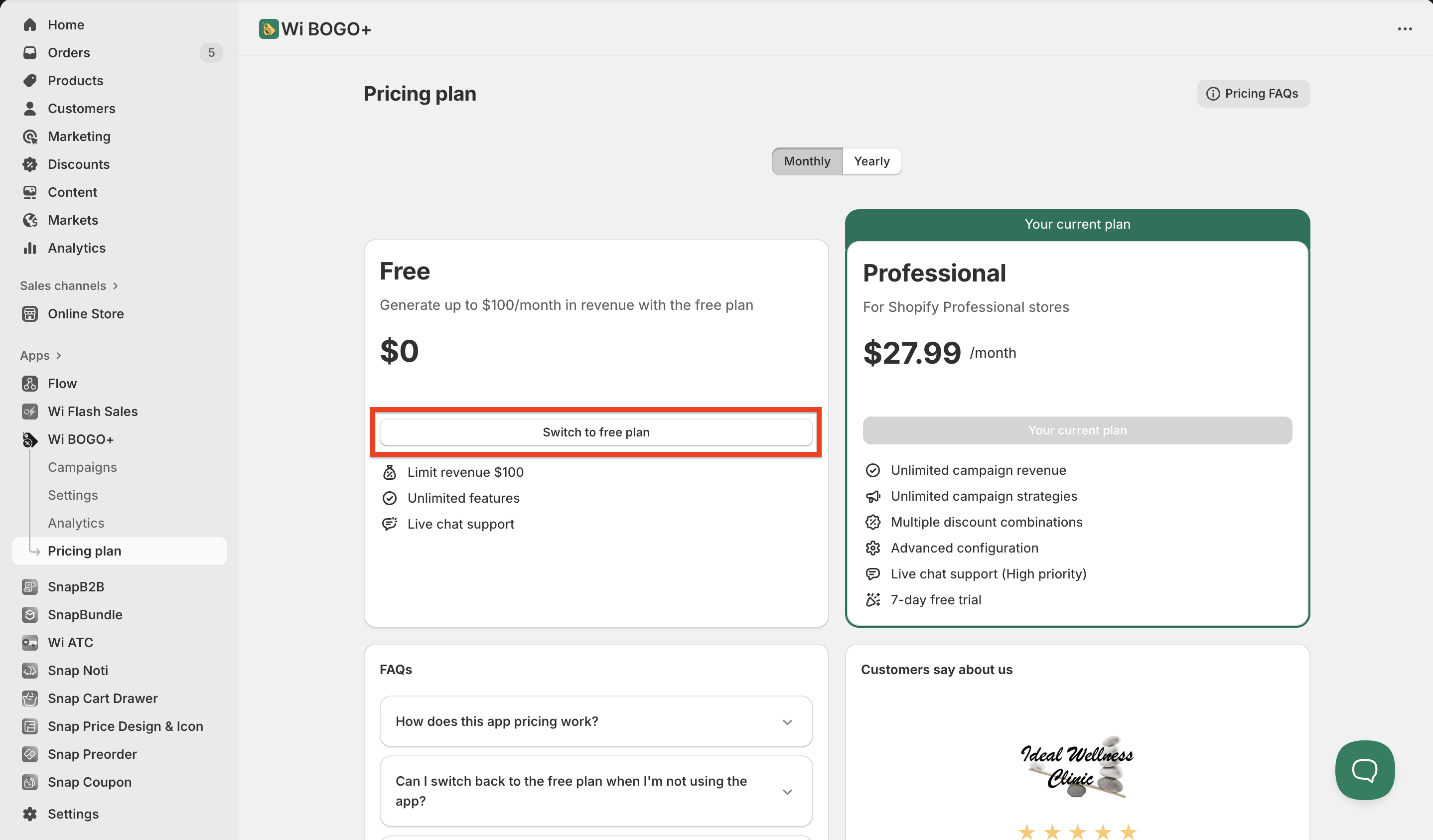 If you decide to downgrade to the free plan, all your campaigns become inactive. With the free plan, you’ll have a revenue limit of $100. Once you reach this limit, the app embed will automatically disappear from the theme editor, and you won’t be able to turn it back on.